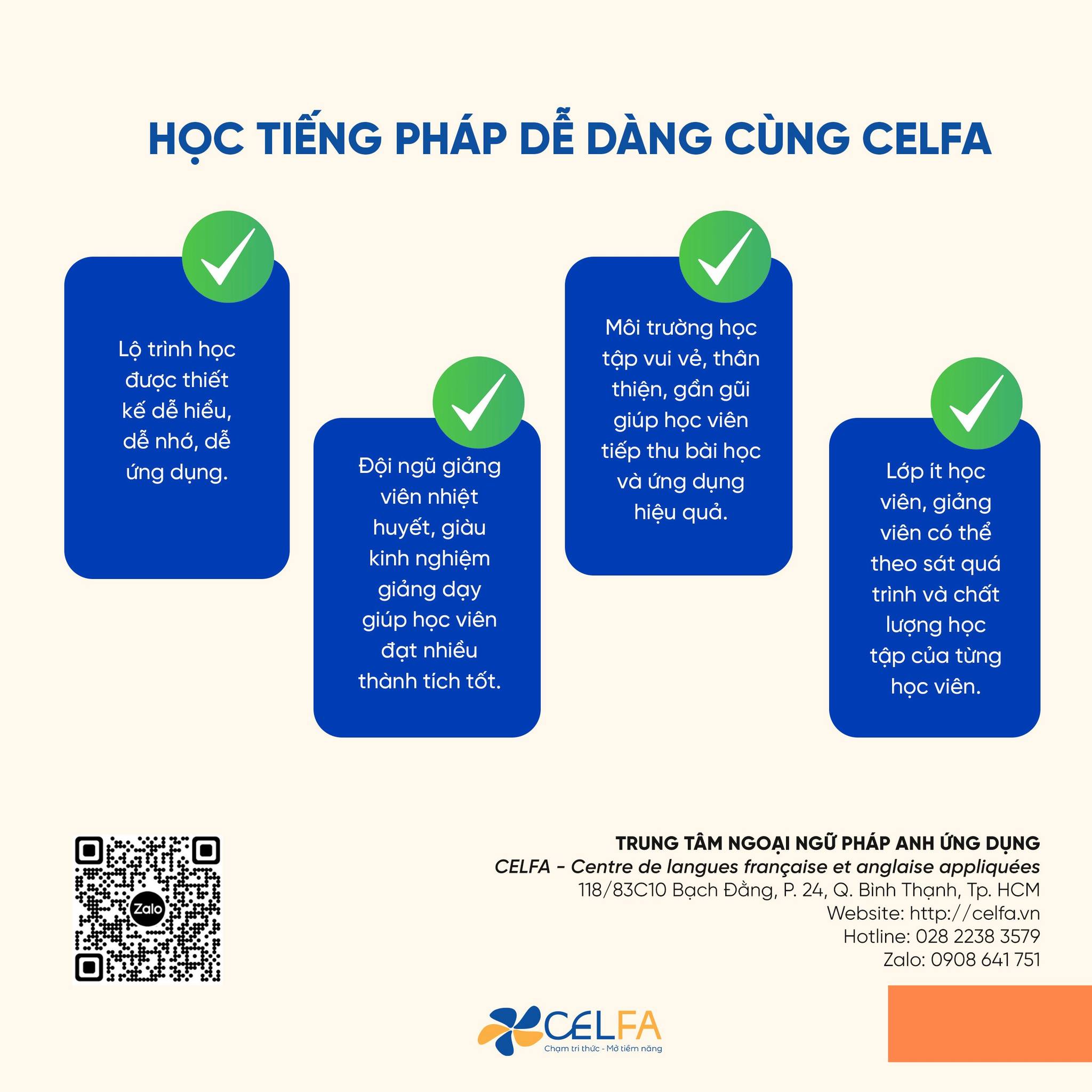 ?‍? Với phương pháp giảng dạy sinh động, sáng tạo cùng hệ thống bài giảng phong phú, được hướng dẫn bởi đội ngũ giáo viên có kinh nghiệm cao, các học viên khi đến với CELFA sẽ được đào tạo bài bản từ trình độ A1.1 (trình độ vỡ lòng) đến B2. Dù cho xuất phát điểm của bạn là số 0 tròn trĩnh, CELFA cũng sẽ đồng hành cùng bạn từ “gà mờ” hoá “master” với lộ trình tối ưu và hiệu quả.