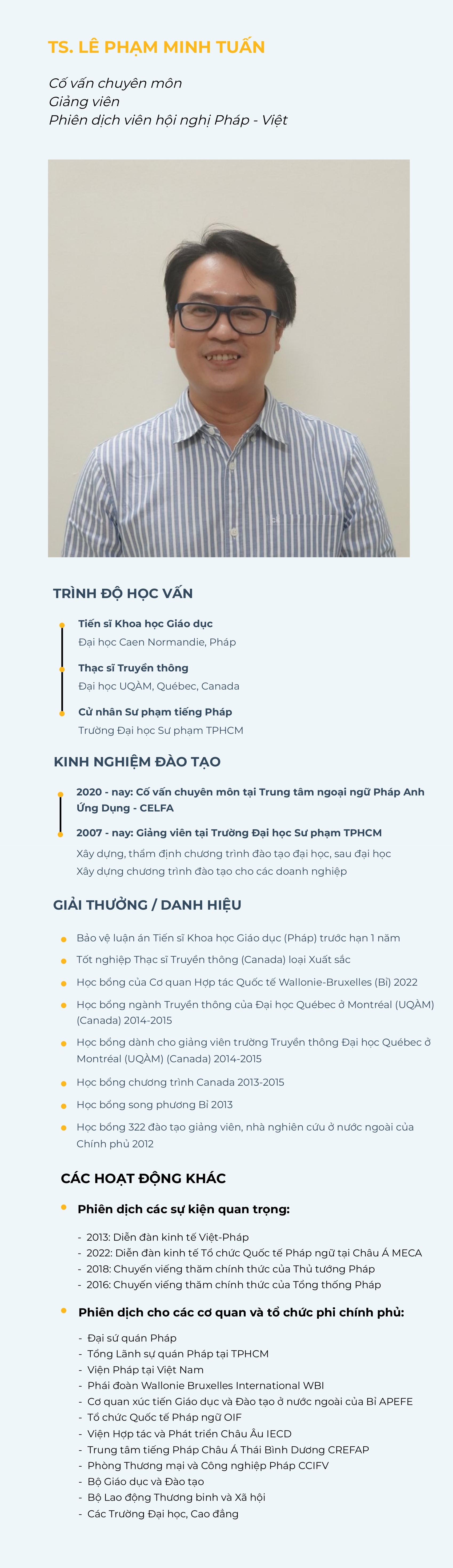 Giảng viên tại CELFA tốt nghiệp từ các trường đại học chuyên ngành trong và ngoài nước (Pháp, Bỉ, Canada) với chuyên môn cao, giàu kinh nghiệm, am hiểu tâm lý.